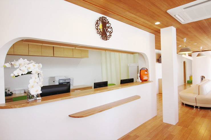 - 正面入ってすぐが受付です。一般待合室は右側、個室待合室3部屋は左側にあります。