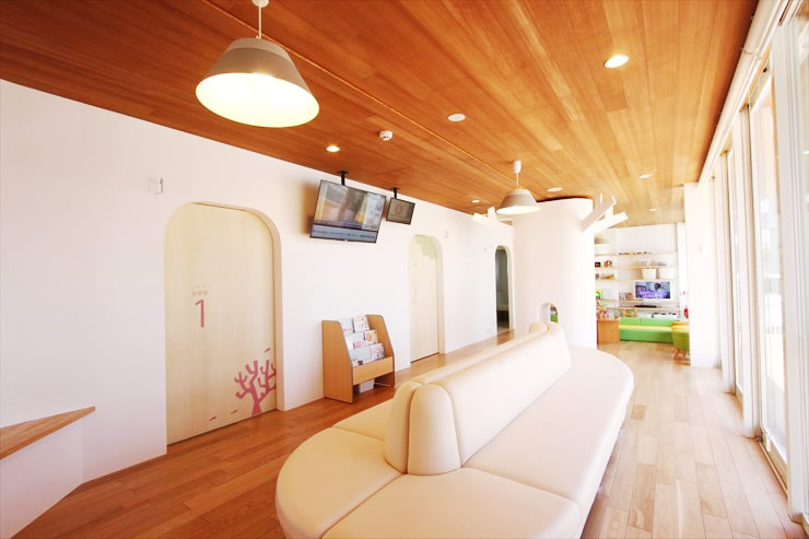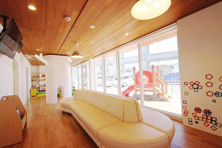 - 木のぬくもりがあたたかい印象の待合室です。奥には広いキッズコーナーがあります。
