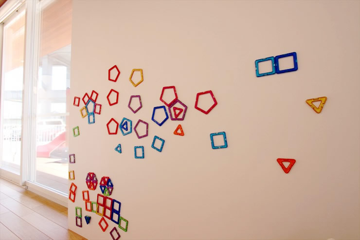 - キッズコーナーが楽しくて帰れない…ということがないように、会計近くの壁にマグネット玩具がくっつく仕掛けがあります。