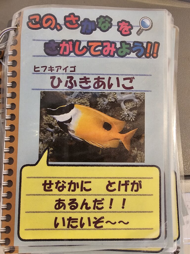 院内では、お魚の特徴がわかる紹介カードもご用意しています。見比べながら観察すると、「これか!」とわかって楽しいですね。